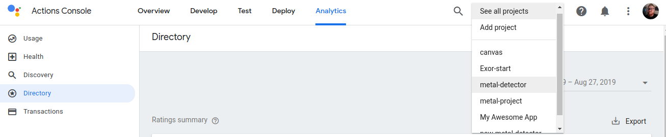 Di konsol Actions, Anda dapat mengklik menu drop-down di navigasi utama untuk beralih antar-project, seperti yang ditunjukkan pada screenshot berikut: