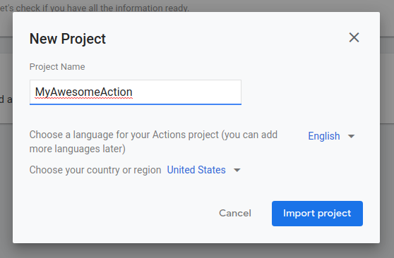 Jika Anda ingin membuat Action di atas project Cloud yang ada atau project Firebase yang ada, pilih project tersebut dari menu drop-down di dalam dialog Project baru. Saat Anda mulai mengetik, nama proyek yang ada akan muncul. Klik project yang ingin Anda impor.