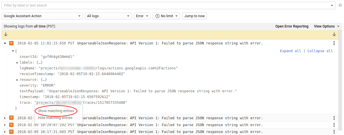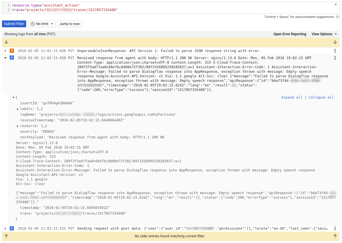 Anda juga dapat mencari peristiwa Debug dengan stempel waktu yang serupa, karena peristiwa tersebut dapat menyertakan informasi tambahan tentang peristiwa lainnya. Dengan memperluas log error dan memfilter menurut kolom trace, daftar yang dihasilkan akan menampilkan semua peristiwa yang terkait dengan error awal: