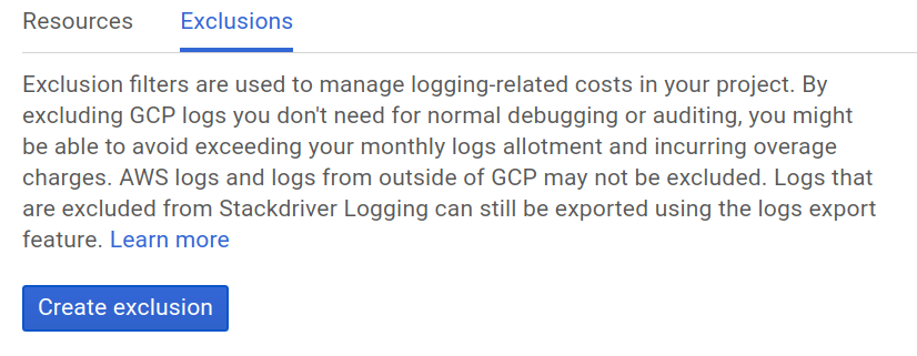 Anda dapat mempelajari lebih lanjut cara mengecualikan peristiwa log yang berbeda di bagian Mengecualikan Log dalam dokumentasi Stackdriver.