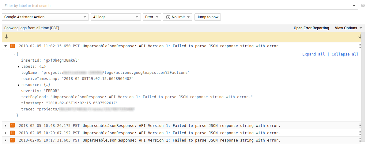 Caso o projeto do Actions falhe ou pareça estar funcionando mal, a causa do problema pode não ser óbvia. No Console do Actions, é possível ver registros detalhados do projeto que trazem mais insights sobre o que está acontecendo.