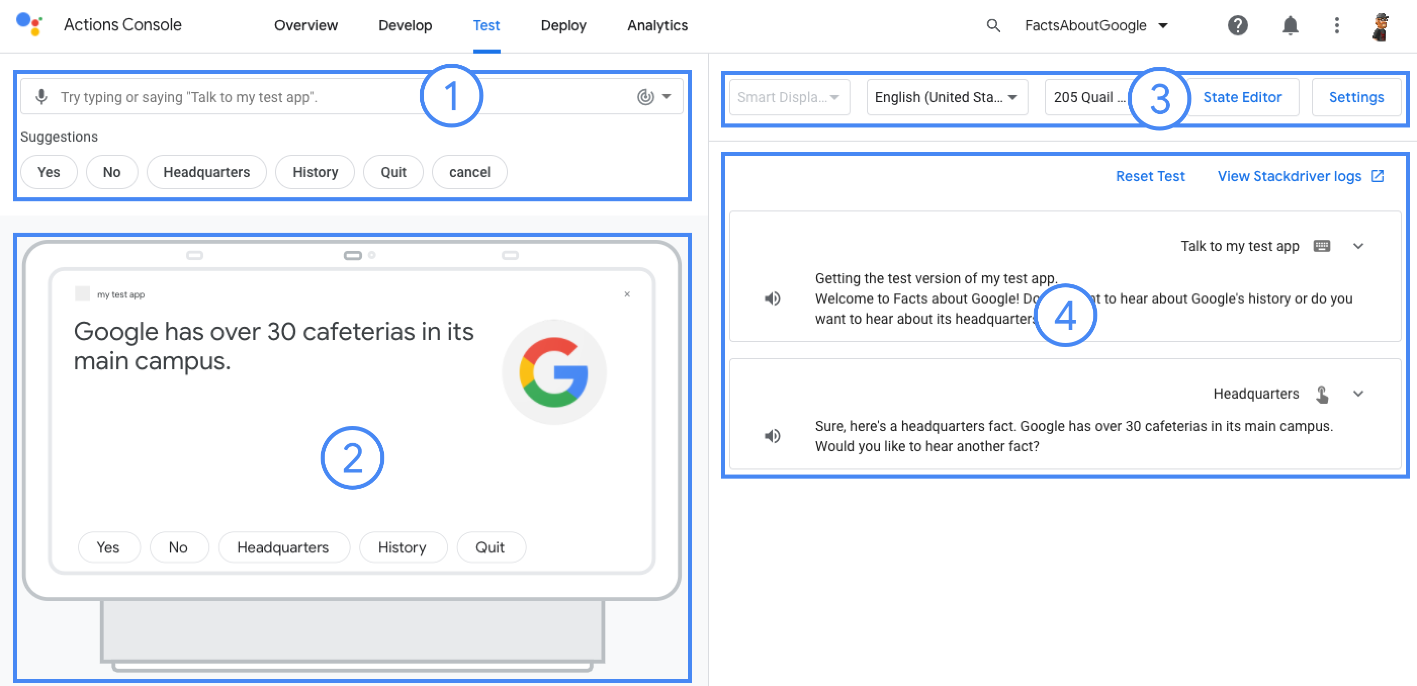 Konsol Actions menyediakan simulator untuk melihat pratinjau Actions Anda. Tujuan memungkinkan Anda melihat informasi debug, menyetel kemampuan perangkat, menyimulasikan lokal, dan lainnya.