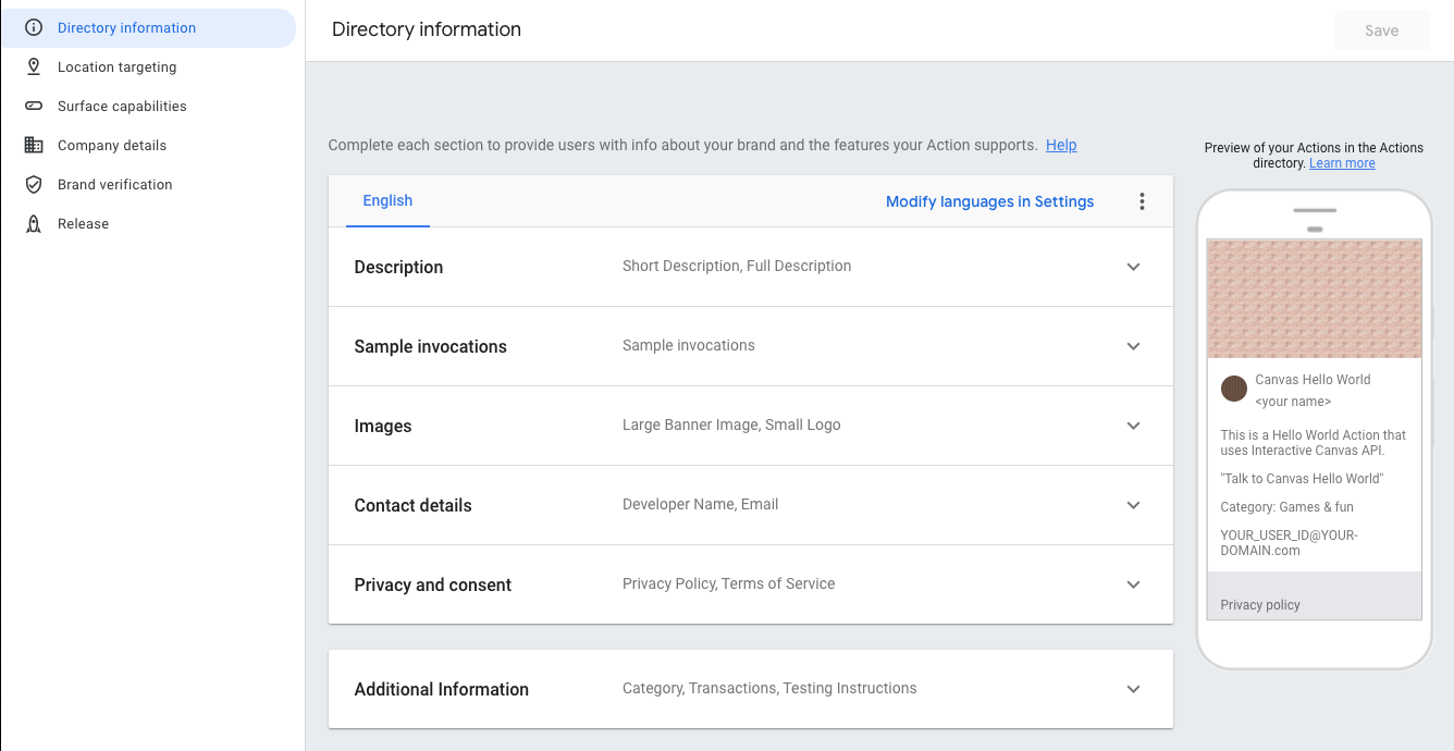 | 目录信息 | 提供相关信息,以便 Actions on Google 能够发布您的 导出到 Google 助理目录。包含元数据和删减内容 有关徽标和横幅图片的项目和图片资源。 |