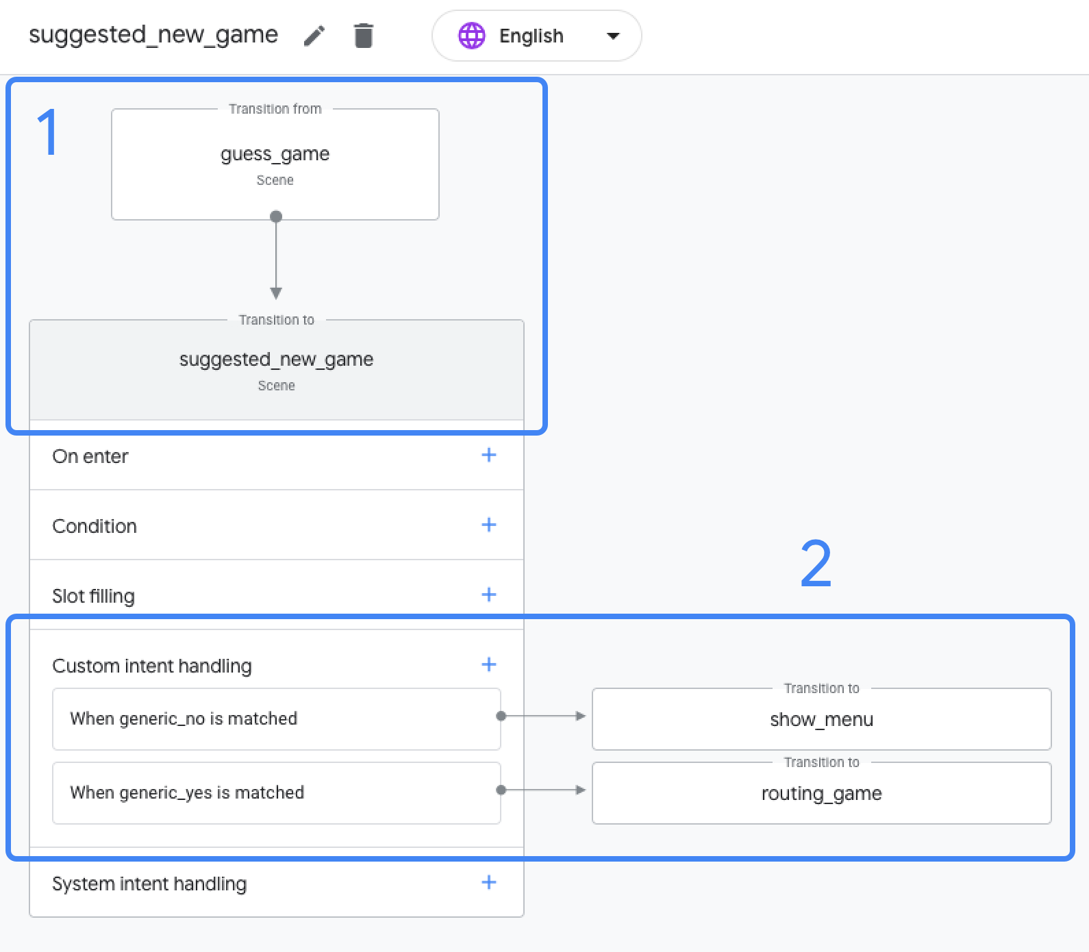 L'interface utilisateur du compilateur permet de comprendre facilement comment les transitions relient les scènes. Dans la figure 1, la scène guess_game passe à la scène suggested_new_game (1). Vous pouvez également voir les deux intents accessibles dans la scène: generic_no et generic_yes. En fonction de l'intent mis en correspondance, la scène suggested_new_game passe à la scène show_menu ou routing_game (2).