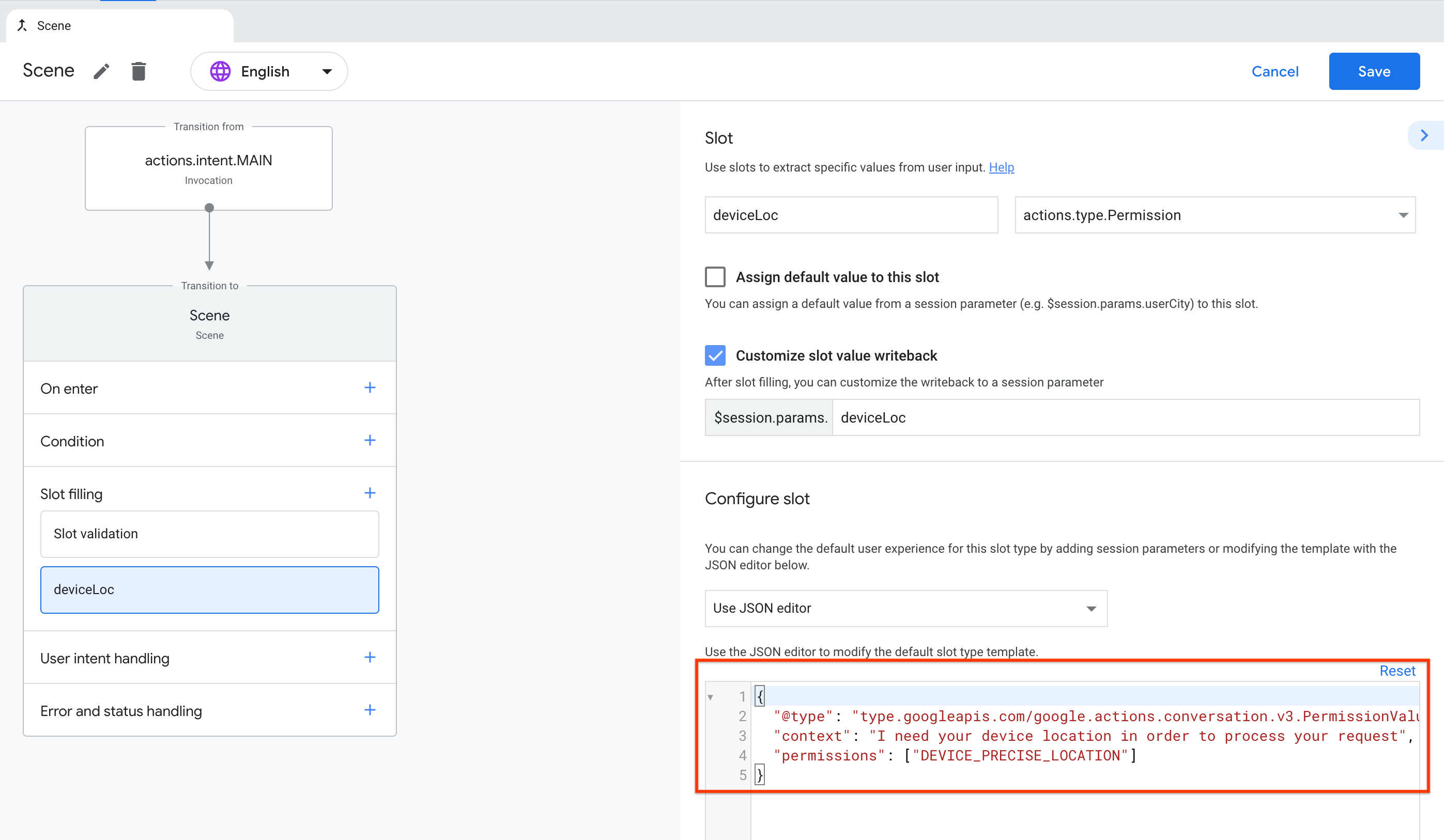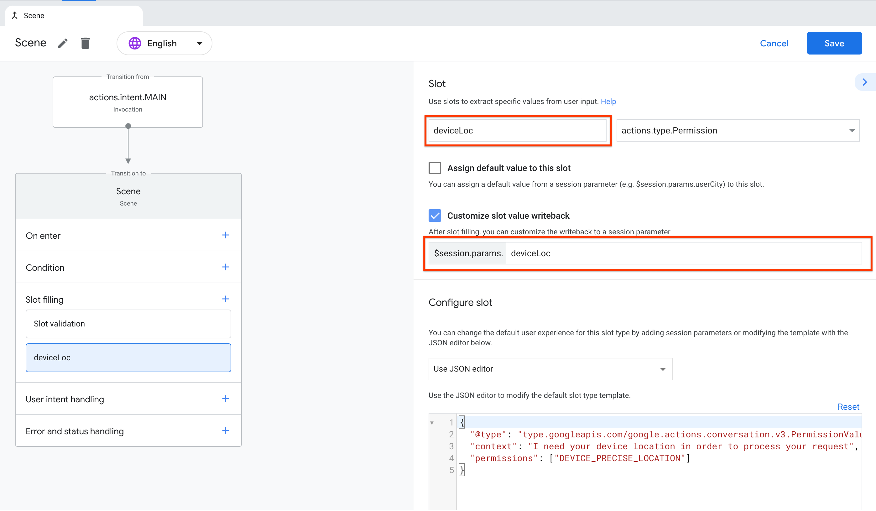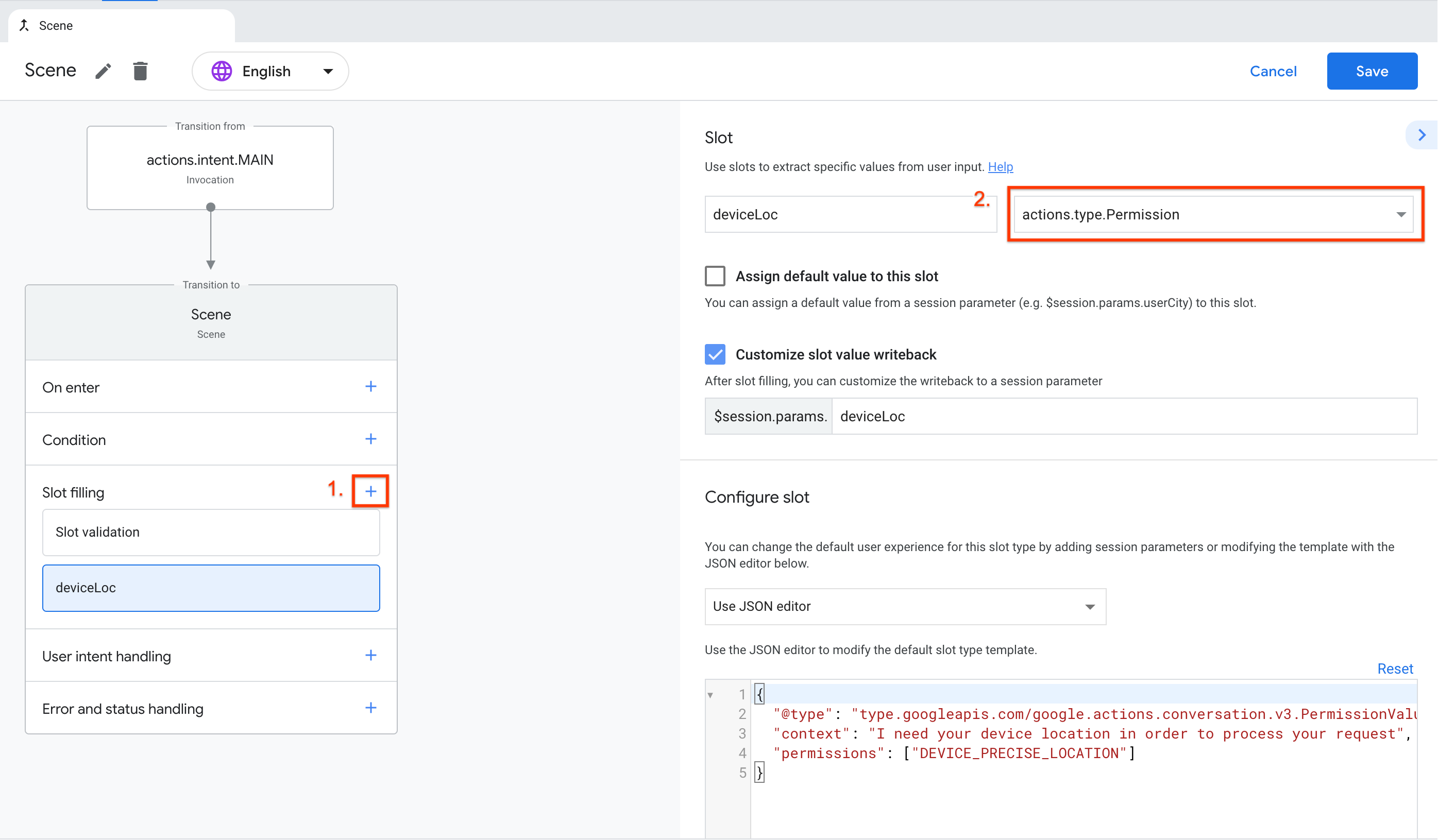 アクションの権限を設定するには、新しいスロットタイプを できます。次に、リクエストするデータ権限のスロットを構成します。