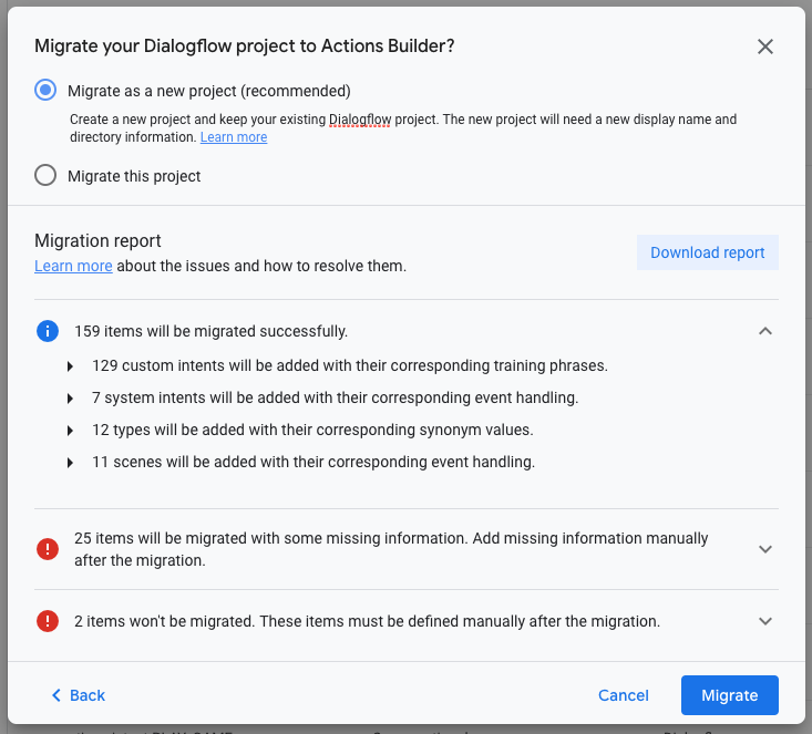 Alat migrasi memiliki dua opsi untuk memigrasikan project Dialogflow Anda ke Actions Builder: