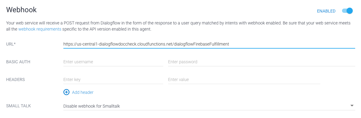 Jika Anda menggunakan Dialogflow: Di bagian Konsol Dialogflow, buka Fulfillment, alihkan tombol Webhook ke ENABLED, lalu ganti URL di kolom URL dengan URL Fungsi Anda.