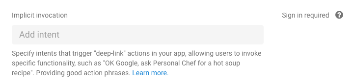 • Intent tambahan untuk membuat deep link ke percakapan Anda: Action ini dipicu saat pengguna memanggil Action Anda berdasarkan namanya dan menentukan frasa pemanggilan (misalnya, "bicara dengan Fakta tentang Google untuk fakta sejarah").