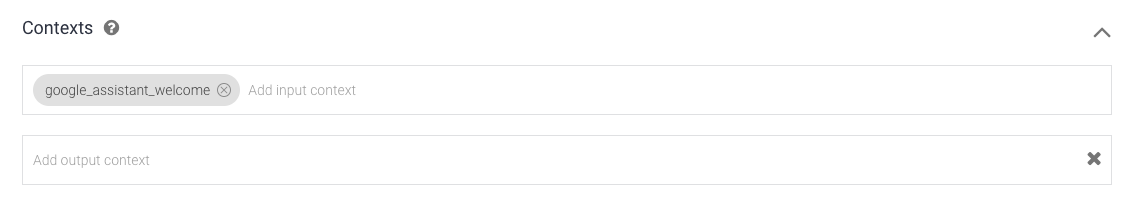 3. Di bagian Contexts, Tentukan google_assistant_welcome sebagai konteks input, lalu tekan tombol enter. (Setelah memasukkan konteks input, google_assistant_welcome akan muncul sebagai konteks output).