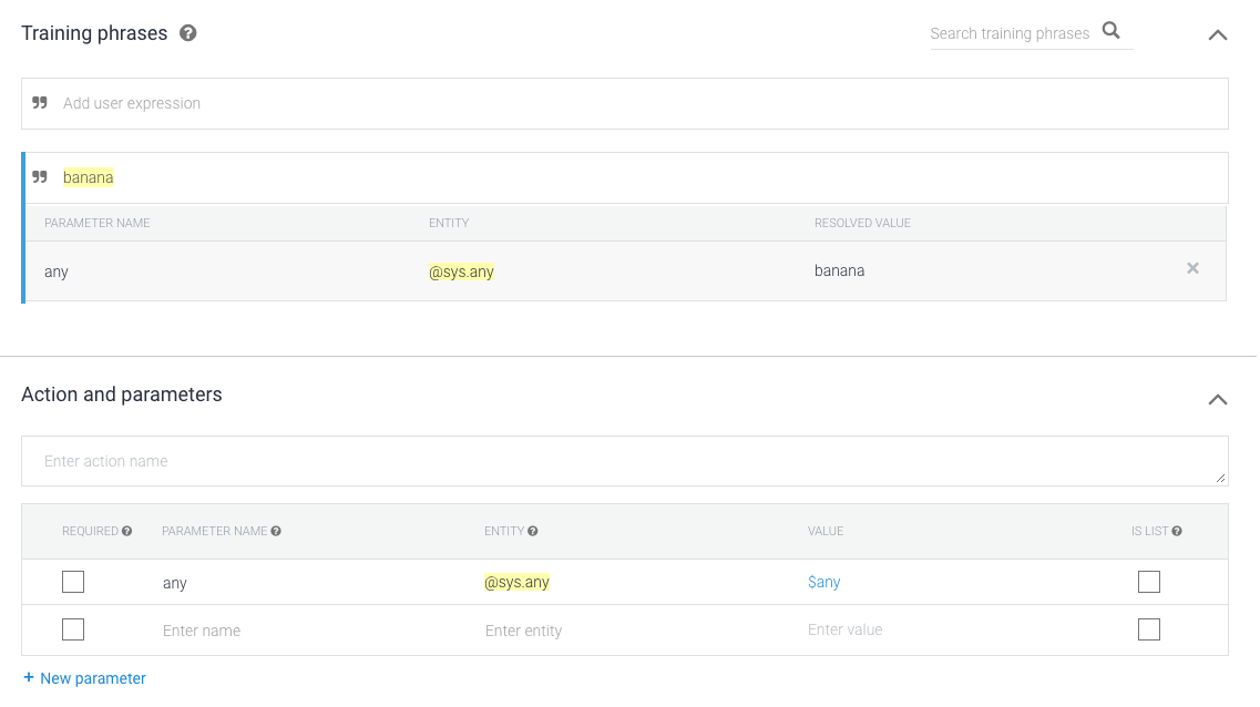 6. Klik dua kali pada banana dan pilih @sys.any. (Kita menggunakan entity @sys.any untuk memberi tahu Dialogflow agar menggeneralisasi ekspresi ke tata bahasa apa pun, bukan hanya banana.)