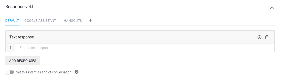 응답 영역에 반환하려는 텍스트 응답을 입력합니다. 있습니다. 기본 텍스트 응답은 여러 Dialogflow 통합에 사용할 수 있습니다 Google 어시스턴트에 관한 대답 설명 응답 페이지에 나와 있습니다.