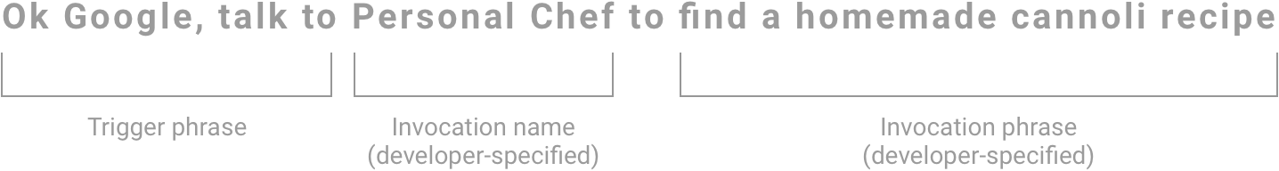 用户可以将您的调用名称与调用短语相结合,以明确调用特定 intent,例如:“Ok Google,与私人厨师交谈,帮我找到食谱。”