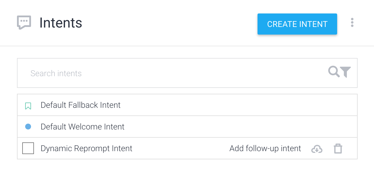 Intent tindak lanjut - Intent lanjutan diterapkan melalui Dialogflow konteks, memastikan bahwa perintah ulang hanya dipicu setelah perubahan tertentu percakapan. Ini berguna untuk {i>reprompt<i} yang disesuaikan di mana Anda ingin menerapkan situasi tertentu.