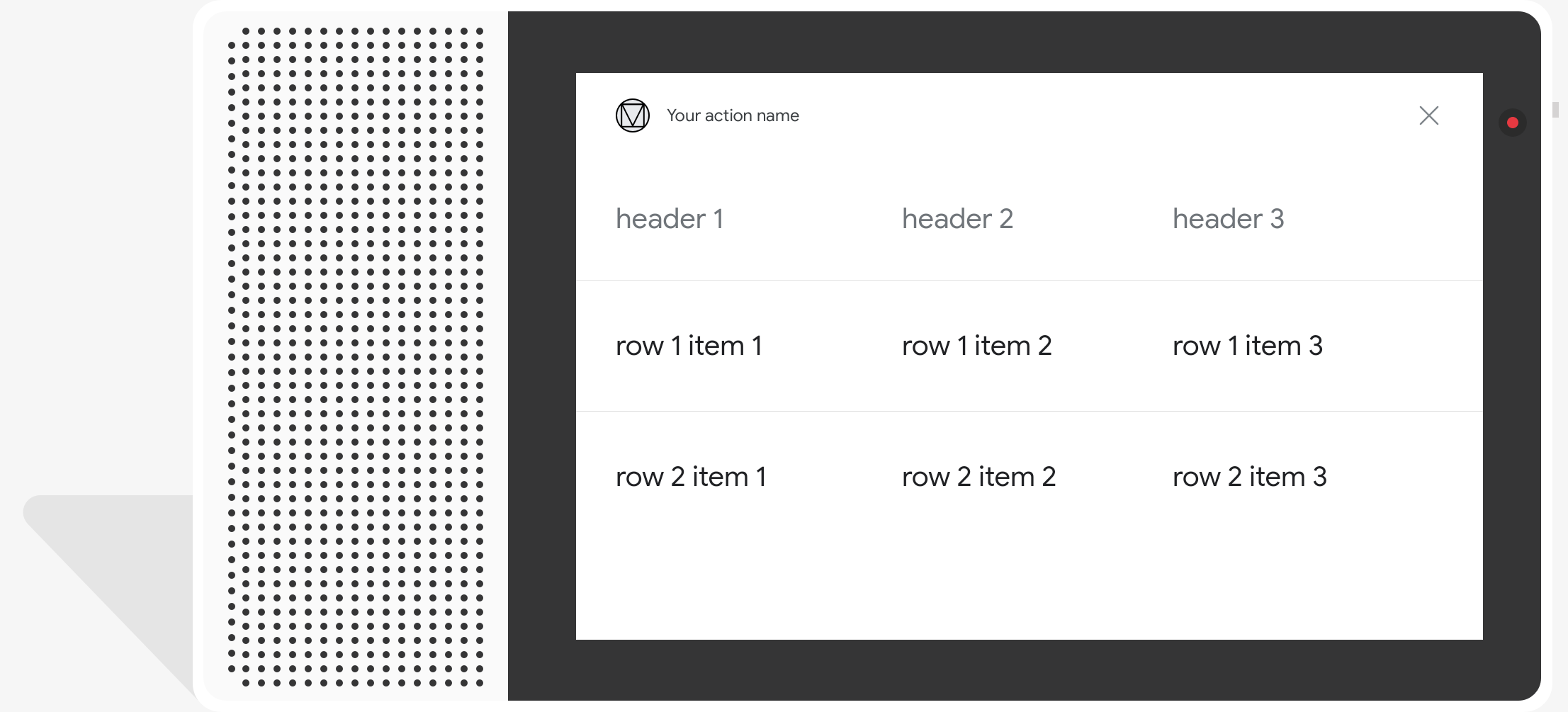 { "payload": { "google": { "expectUserResponse": true, "richResponse": { "items": [ { "simpleResponse": { "textToSpeech": "This is a simple table example." } }, { "tableCard": { "rows": [ { "cells": [ { "text": "row 1 item 1" }, { "text": "row 1 item 2" }, { "text": "row 1 item 3" } ], "dividerAfter": true }, { "cells": [ { "text": "row 2 item 1" }, { "text": "row 2 item 2" }, { "text": "row 2 item 3" } ], "dividerAfter": true } ], "columnProperties": [ { "header": "header 1" }, { "header": "header 2" }, { "header": "header 3" } ] } }, { "simpleResponse": { "textToSpeech": "Which response would you like to see next?" } } ] } } } }