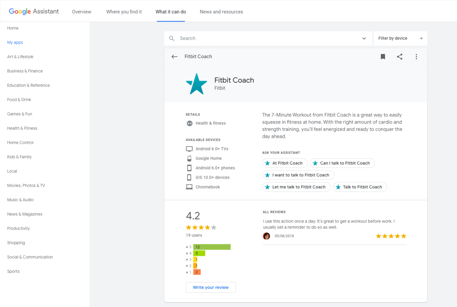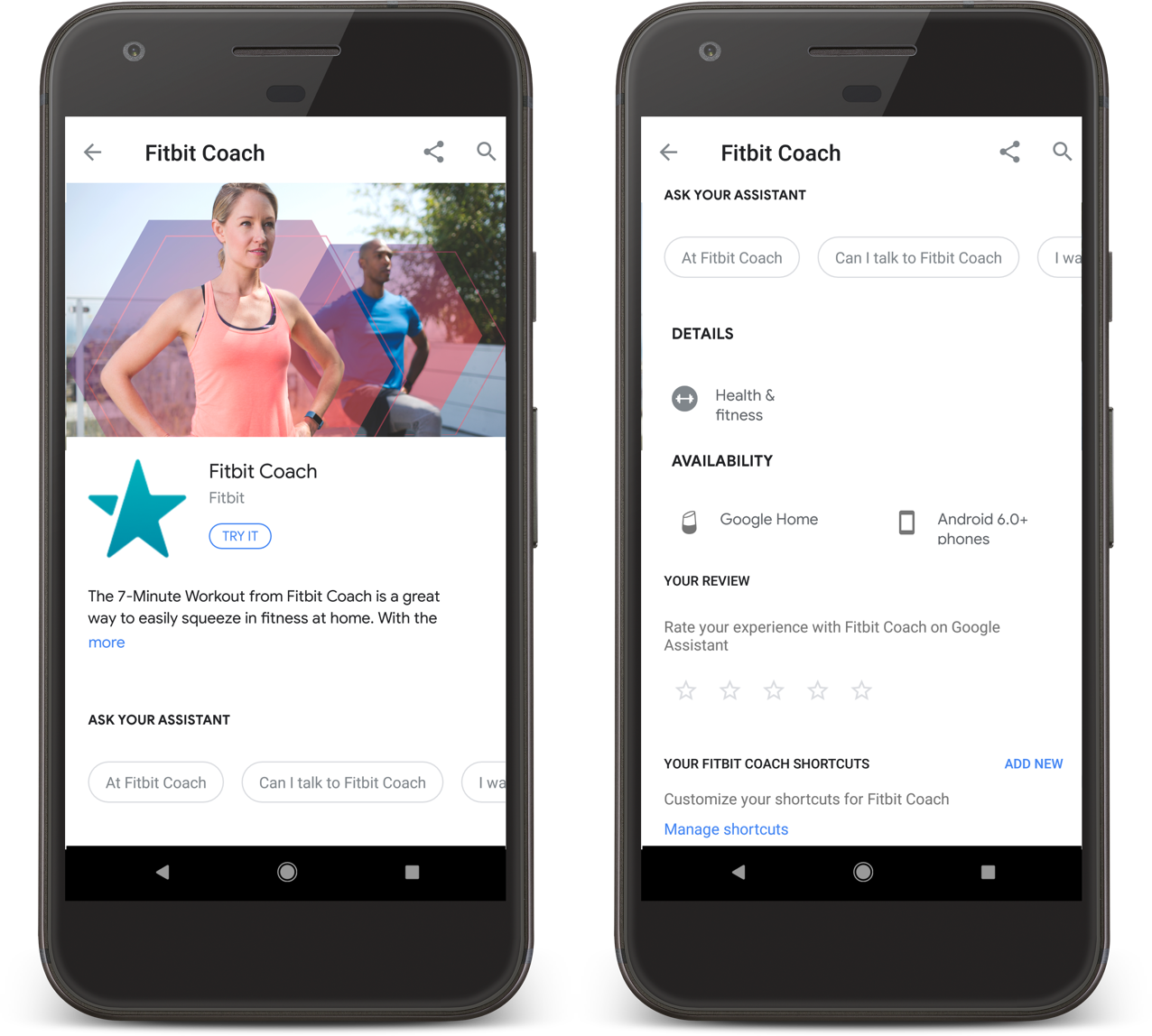 Contoh berikut menampilkan halaman untuk Fitbit Coach, Action kesehatan & kebugaran yang memandu pengguna melalui latihan fisik di rumah: