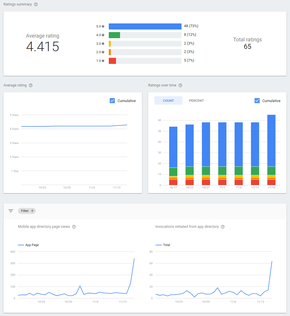Konsol Action memiliki fitur analisis yang menunjukkan bagaimana Action Anda diberi rating di direktori Asisten seluler. Buka Analytics > Direktori untuk mengetahui detail tentang rating Action Anda dari waktu ke waktu.