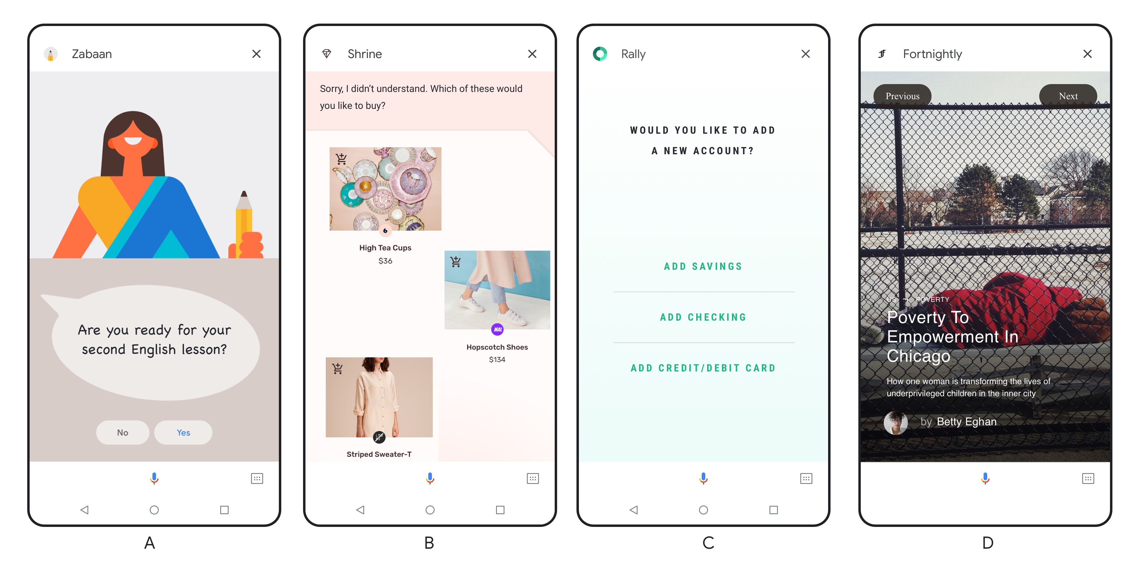 - Projete com foco em voz. Projetar sua ação de tela interativa para que a voz seja focada em vozes é ainda mais importante para smart displays. Diferentemente do de um dispositivo móvel, o usuário pode estar do outro lado da sala e apenas se comunicando com o smart display por voz. Por esse motivo, nem sempre é possível confiar que o usuário toca no dispositivo para prosseguir com a ação e precisa garantir que eles possam prosseguir na ação usando voz.