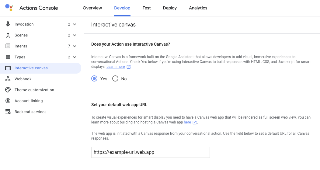 Saat menggunakan Actions Builder, ikuti langkah-langkah tambahan berikut untuk mengaktifkan Interaktif {i>Canvas<i}: