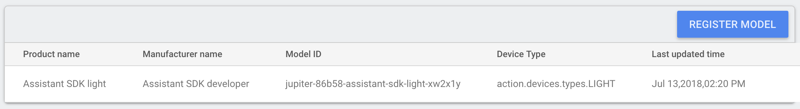 등록 도구를 사용하여 (Google 어시스턴트 SDK 샘플에 포함됨) 또는 REST API 기기 모델을 등록할 수 있습니다.
