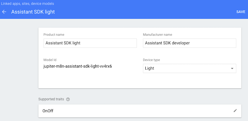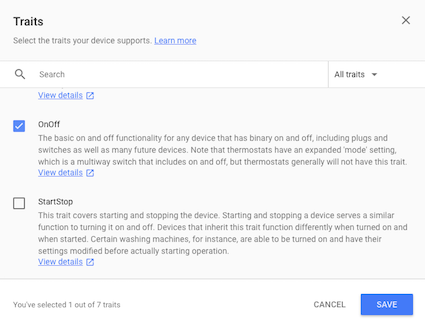 [null,null,["تاريخ التعديل الأخير: 2025-07-25 (حسب التوقيت العالمي المتفَّق عليه)"],[],["Device functionality is enabled by declaring supported abilities, known as traits, within a device model. These traits, provided by Google, are reusable across various devices. To add a trait, users must access the Actions Console, navigate to Device Registration, select a model, and edit its Supported traits. For instance, to add On/Off control for an LED, the OnOff trait is selected and saved in the device's model, with another save step to finalize.\n"]]
