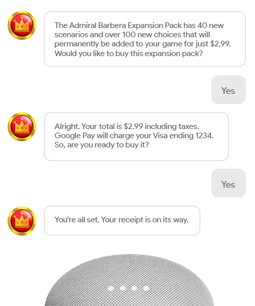 [null,null,["Terakhir diperbarui pada 2025-07-25 UTC."],[],["Smart speakers enhance home audio experiences. Key actions include investing in sound design using SSML and Google's sound library, avoiding complex conversational flows, and leveraging helpers for high-quality conversations. Sample dialogs should be written to refine the conversational design. Examples of Actions to try are Castle Master, Mickey Mouse Adventure, and Tender, with Number Genie provided as a sample.\n"]]