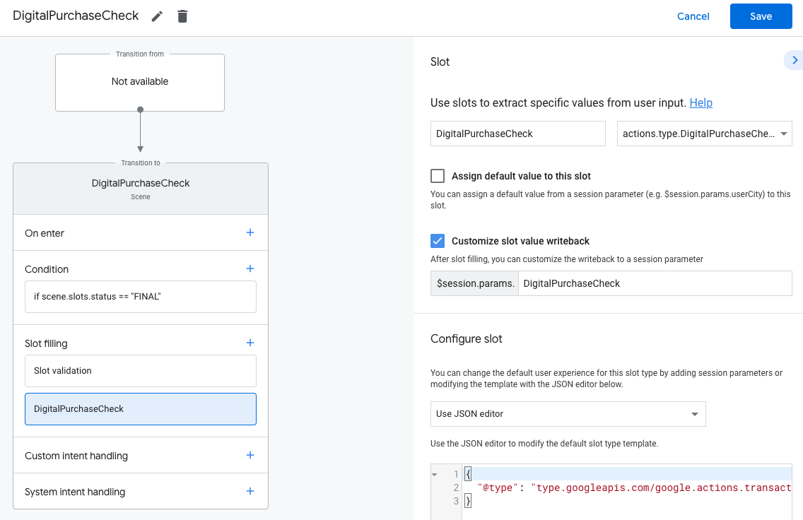 Actions Builder では、代わりに JSON エディタを使用してスロットを構成できます。