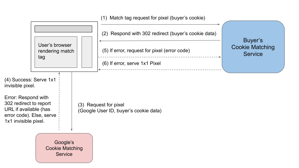 Ao responder a uma solicitação de correspondência exata do Pixel enviada a você por HTTPS, é necessário redirecionar para o serviço de correspondência de cookies por HTTPS. Da mesma forma, um endpoint do Cookie Match Assist que redireciona para os bidders também precisa usar HTTPS. Se você enviar solicitações ao Google por HTTP mais de uma vez a cada dois minutos, o número de solicitações de correspondência enviadas à sua conta será limitado.