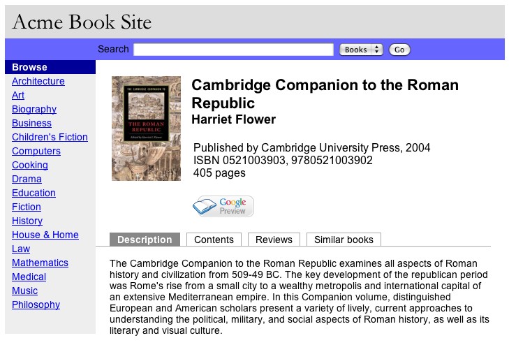 與 Google 圖書的醒目連結。您的應用程式中顯示的每本書都須具備醒目連結,例如:(1) 網站中具有 Google 預覽功能的頁面,或 (2) 該書籍的 Google 圖書頁面。如要直接從搜尋結果連結到預覽畫面,請務必使用上述的「Google 預覽」圖片。