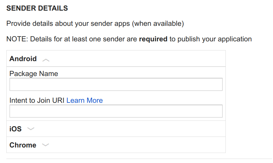 Чтобы использовать функцию «Намерение присоединиться», необходимо добавить URI приложения и имя пакета в консоль разработчика Google Cast .