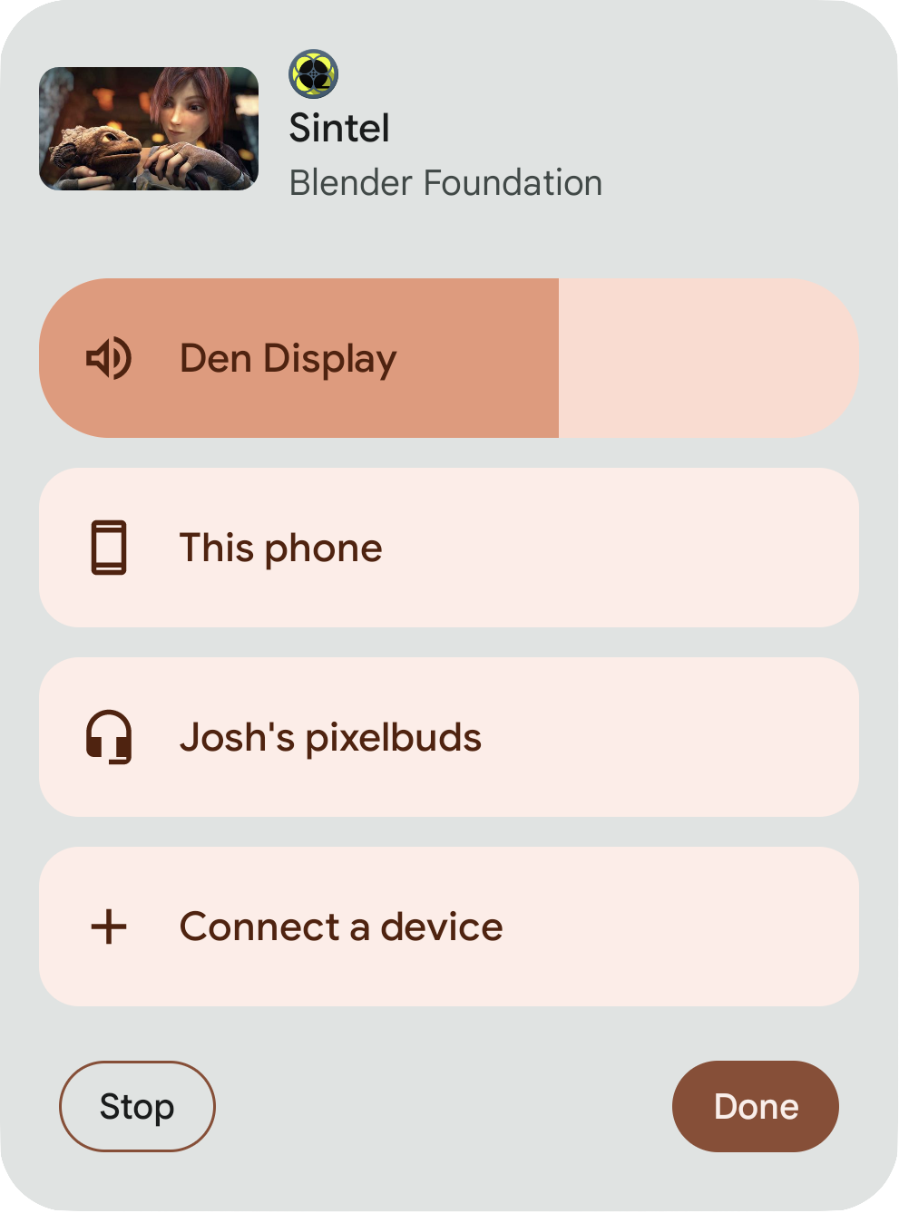Aplikasi audio yang menggunakan Pengalih Output memiliki kemampuan untuk memperluas audio ke beberapa perangkat speaker yang kompatibel untuk Cast selama sesi Cast menggunakan Perluasan Streaming.