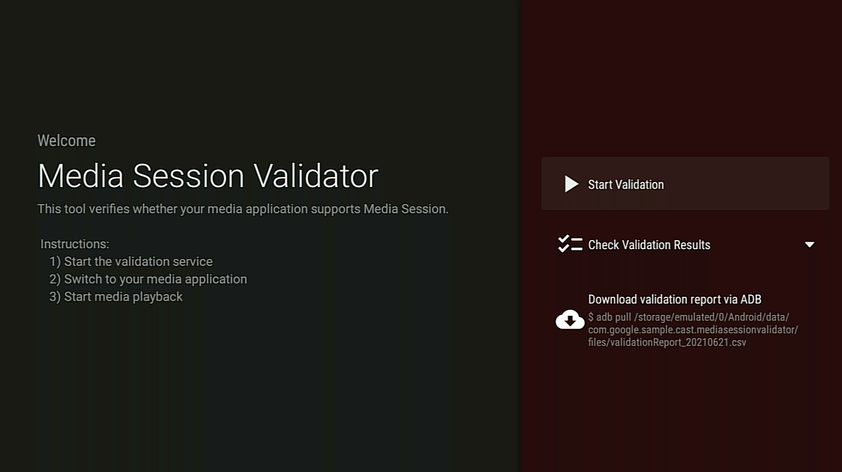 O Media Session Validator é uma ferramenta que oferece uma maneira fácil e automatizada de verificar a integração do aplicativo Android TV com a sessão de mídia. Ele também verifica os pré-requisitos para oferecer suporte à Cast Connect no aplicativo Android TV.