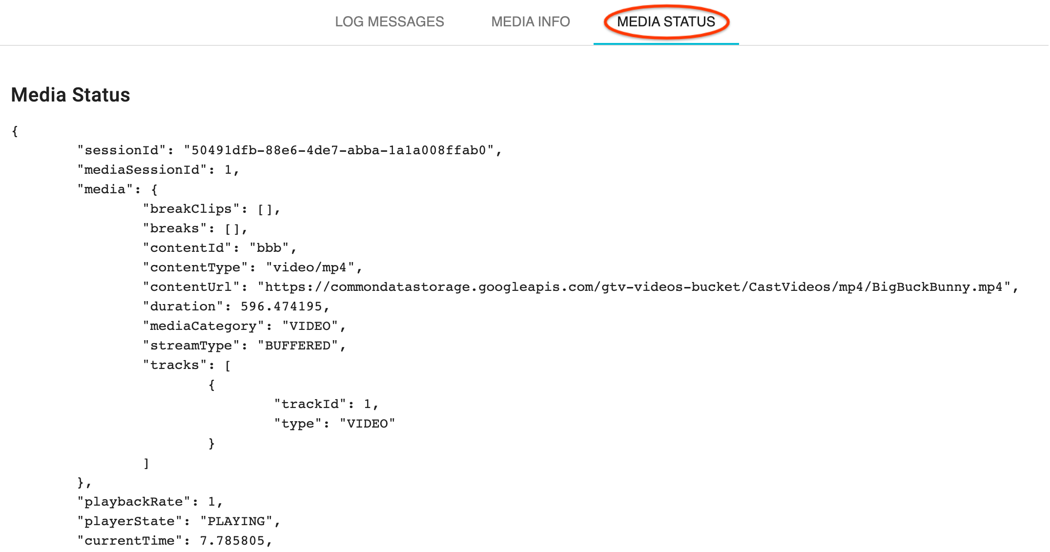 Wenn eine Medienwiedergabe gestartet wird, empfängt das CaC-Tool Medienstatusmeldungen von Ihre Web Receiver App und zeigt sie auf dem Tab MEDIENSTATUS an.