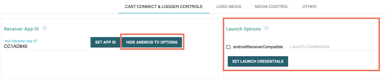 Lorsque l'outil CaC est connecté à l'application Web Receiver, l'icône Cast s'affiche avec une forme de cadre rempli. L'ID de l'application Web Receiver et l'ID de session sont également affiché en haut de l'outil.