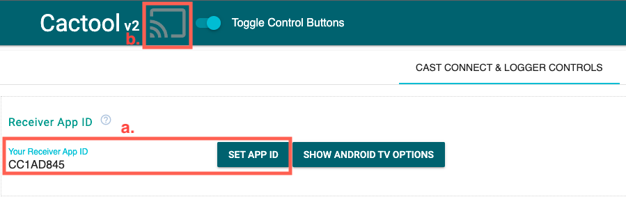 ปุ่ม "แคสต์" จะปรากฏขึ้นเมื่อเครื่องมือ CaC เชื่อมต่อกับแอปตัวรับเว็บ ที่มีรูปร่างของเฟรมเต็ม รหัสแอปตัวรับเว็บและรหัสเซสชันยัง แสดงอยู่ที่ด้านบนของเครื่องมือ