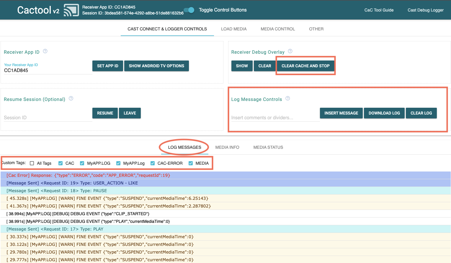 如果您的 Web 接收器应用启用了 Cast Debug Logger,CaC 工具 捕获日志消息并控制 Web Receiver 调试叠加层。