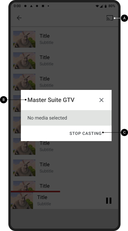 - Pour une expérience utilisateur optimale, fournissez des commandes persistantes en plus de celles de la boîte de dialogue Cast.