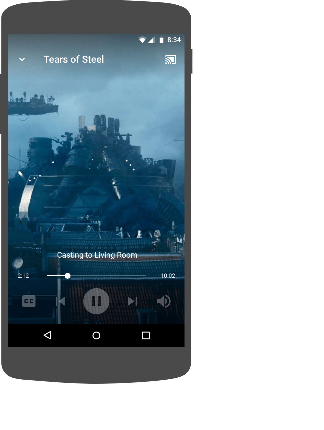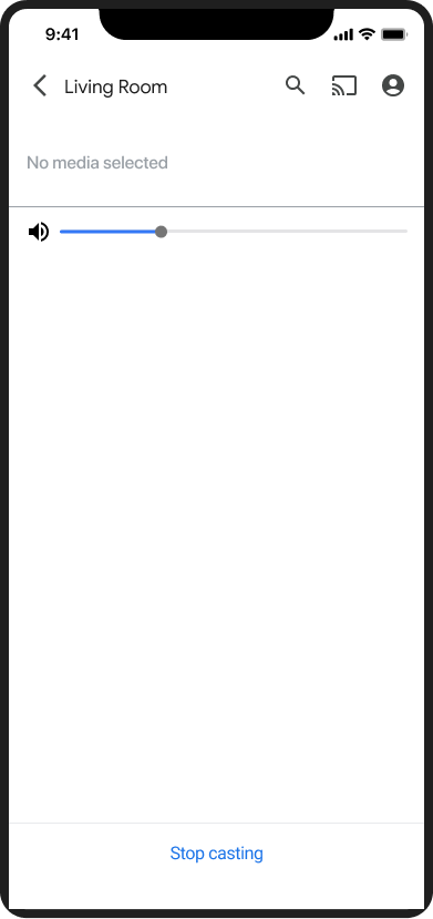O receptor reproduz o conteúdo e reflete o estado dele para o usuário. O destinatário precisa responder imediatamente às ações no app do remetente . Por exemplo, quando o conteúdo é pausado no receptor, um ícone de pausa é exibido. Quando o usuário pressiona o botão de reprodução no app remetente, o receptor começa a reproduzir o conteúdo e remove o ícone de pausa.