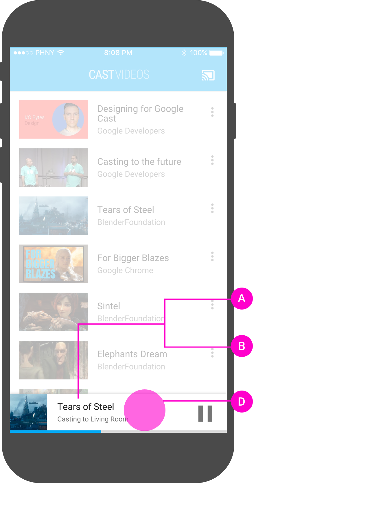 Sender apps should provide Cast controls in these areas: