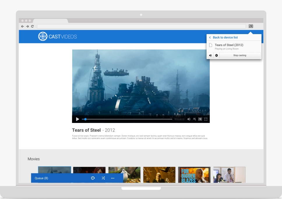 A small, persistent control known as the mini controller should appear, while casting, when the user navigates away from the current content page or expanded controller to another view within the sender app. The mini controller is a visible reminder of the current cast and provides instant access to it.