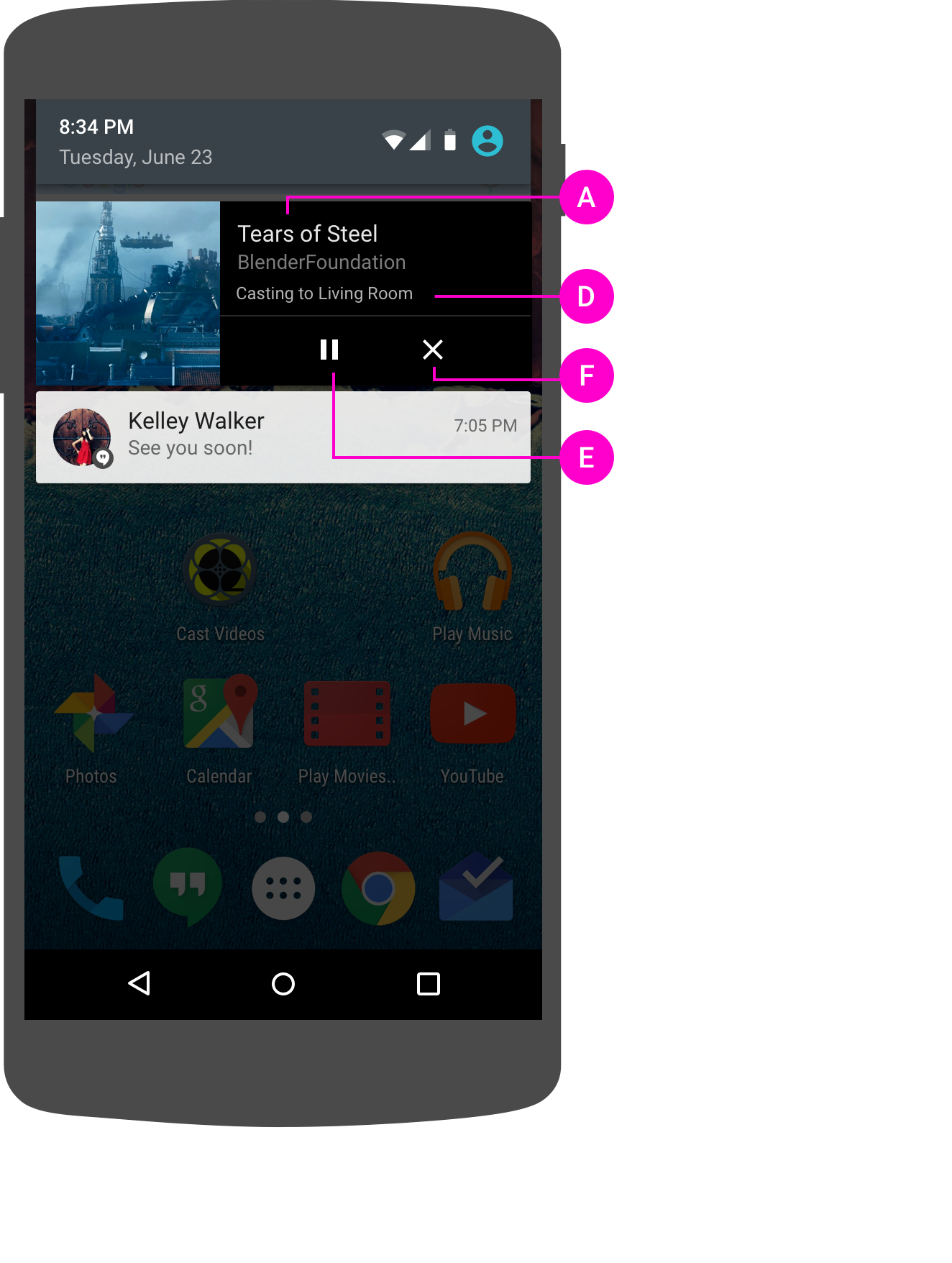 B Lorsqu'une application émettrice se déconnecte de manière implicite (par exemple, lorsque la batterie de l'appareil émetteur est déchargée ou que la connexion réseau de l'appareil émetteur au Web Receiver est interrompue), elle n'a aucun effet sur le Web Receiver et supprime les commandes et les notifications Cast de l'appareil émetteur. L'application émettrice doit suivre les déconnexions implicites et tenter de se reconnecter à un Web Receiver lorsque l'application émettrice est rouverte.