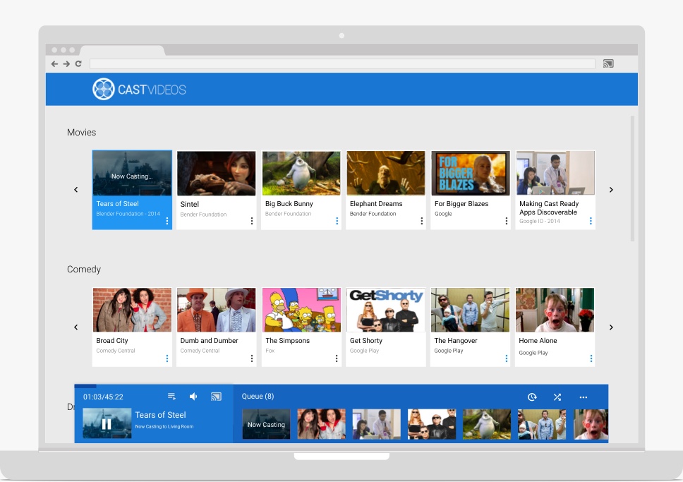 L'état de lecture Cast et les commandes de l'application émettrice dans ces zones doivent être synchronisés avec les modifications de lecture qui se produisent sur le Web Receiver, même si elles ne proviennent pas de l'application émettrice. Cela permettra de gérer correctement les commandes multi-émetteurs et le contrôle de la lecture provenant des télécommandes, des boutons, etc. de l'appareil.