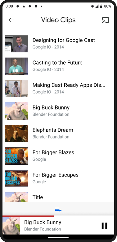 在投放时,当用户从当前内容页面或展开的控制器导航到发送器应用内的另一个视图时,应显示一个称为迷你控制器的小型持久性控件。迷你控制器会以可见的方式提醒用户当前正在投放,并提供对投放的即时访问权限。