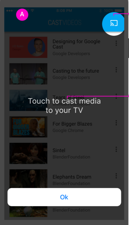 Widżety platformy Cast obsługują protokół Apple UIAppearance Protocol UIKit zmienić wygląd widżetów w aplikacji, np. ich położenie lub wokół przycisku. Za pomocą tego protokołu możesz określić styl widżetów platformy Cast, pasują do istniejącego stylu.