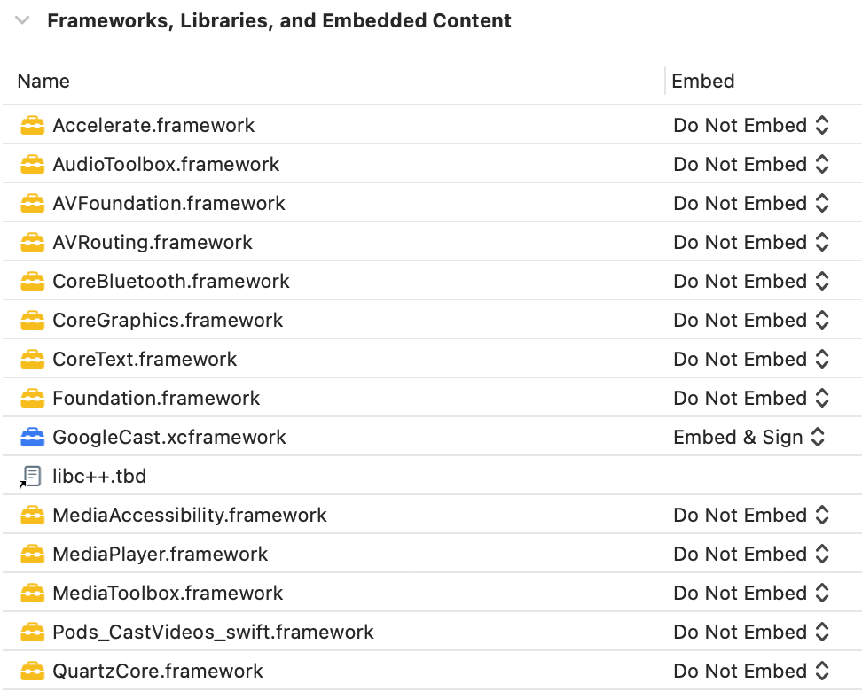 General标签页下,为GoogleCast.xcframework选择Embed and Sign。