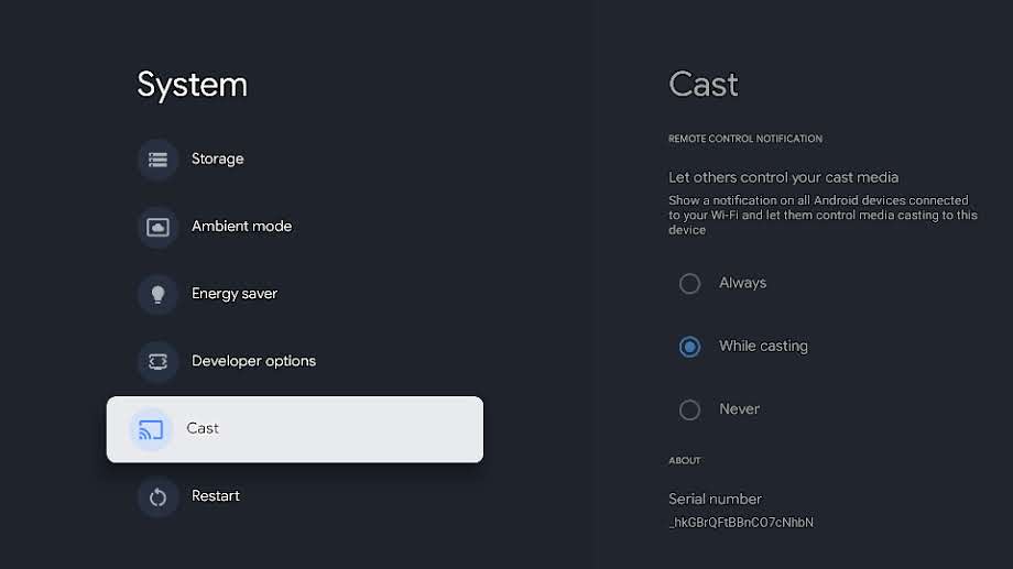 Os dispositivos Android TV (ATV) têm vários números de série associados a eles. O número de série do software (Cast) pode ser obtido transmitindo a página do Play Console para o dispositivo ATV, conforme descrito acima, ou colocando o dispositivo ATV no modo de desenvolvedor e procurando o número de série do software nas configurações do Cast.