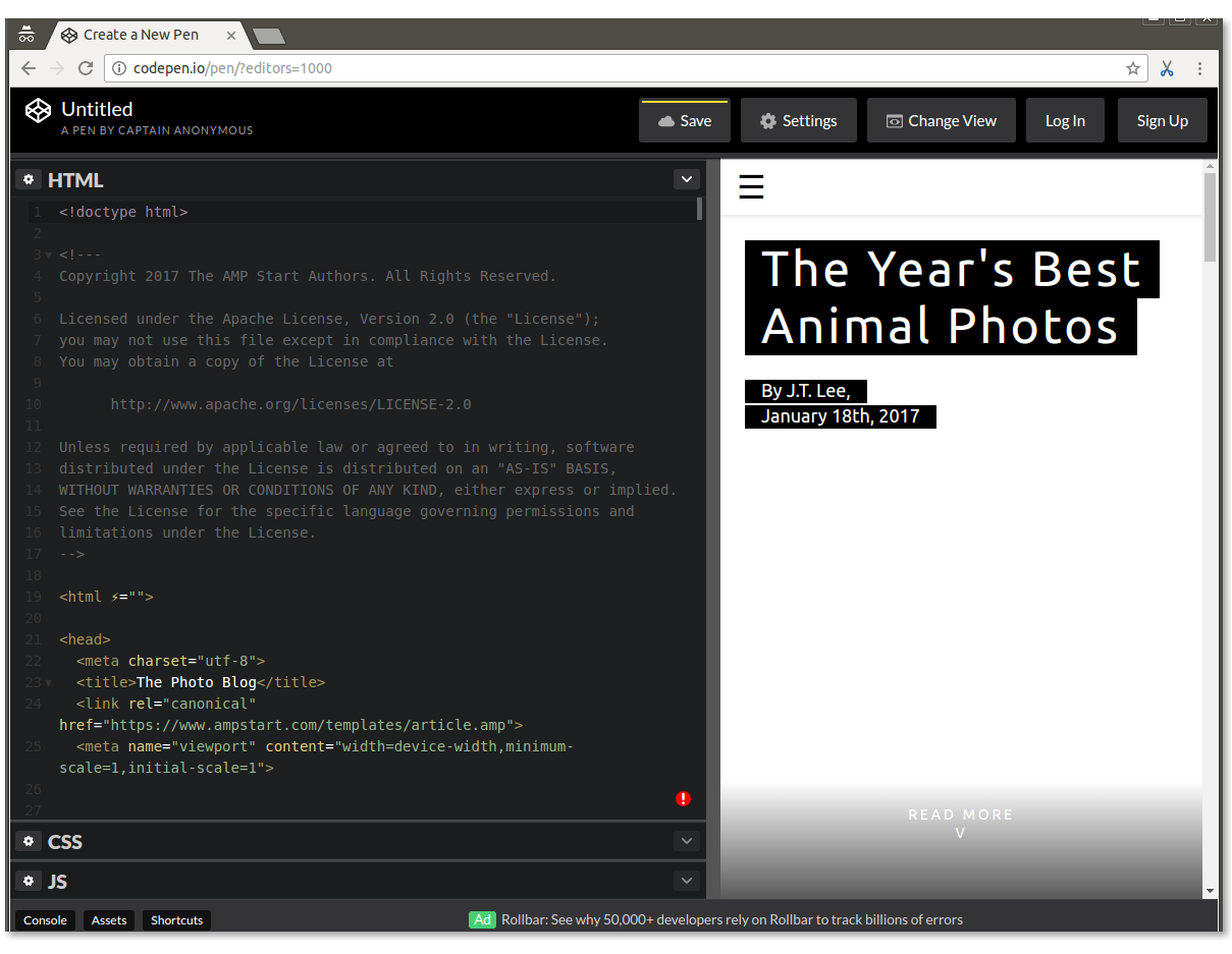 访问 AMP 模板,然后下载“年度最佳动物照片”模板的“简单文章”代码。