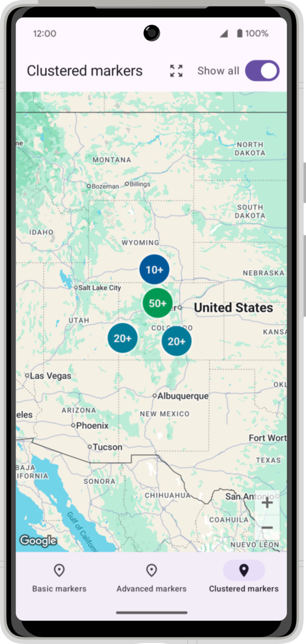 다른 마커 유형과 마찬가지로 클러스터링된 마커는 맞춤설정할 수 있습니다. Clustering 컴포저블의 clusterItemContent 매개변수는 클러스터링되지 않은 항목을 렌더링하는 맞춤 컴포저블 블록을 설정합니다. @Composable 함수를 구현하여 마커를 만듭니다. SingleMountain 함수는 맞춤 배경 색상 구성표를 사용하여 컴포저블 Material 3 Icon를 렌더링합니다.