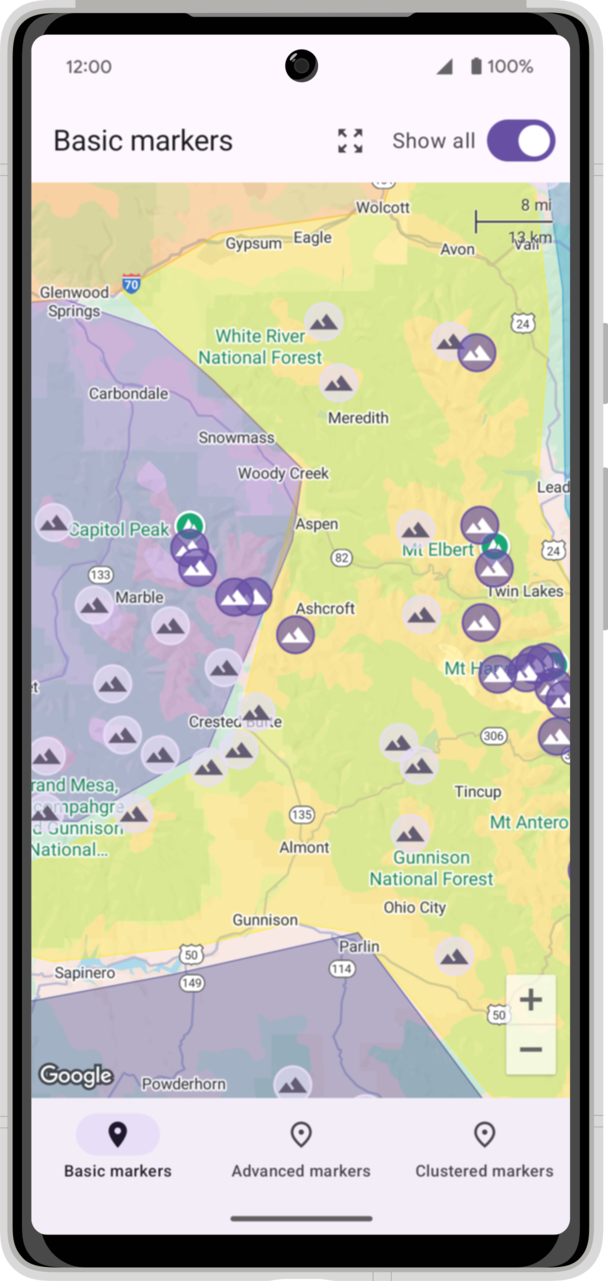 與其他標記類型一樣,叢集標記可自訂。Clustering 可組合函式的 clusterItemContent 參數會設定自訂可組合函式區塊,以算繪非叢集項目。實作 @Composable 函式來建立標記。SingleMountain 函式會以自訂背景色彩配置,算繪可組合的 Material 3 Icon。