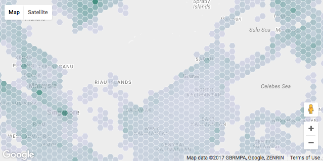 此示例使用 Node.js Cloud Functions 函数进行服务器身份验证。借助 Earth Engine API 和 TurfJS,该函数会为六边形网格可视化创建 GeoJSON。该网页是静态网页(托管在 Cloud Storage 中),并在地图上显示了六边形网格可视化图表。与其他示例不同,此演示版不使用 App Engine。
