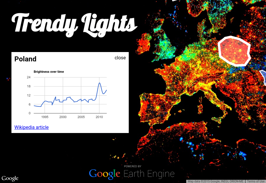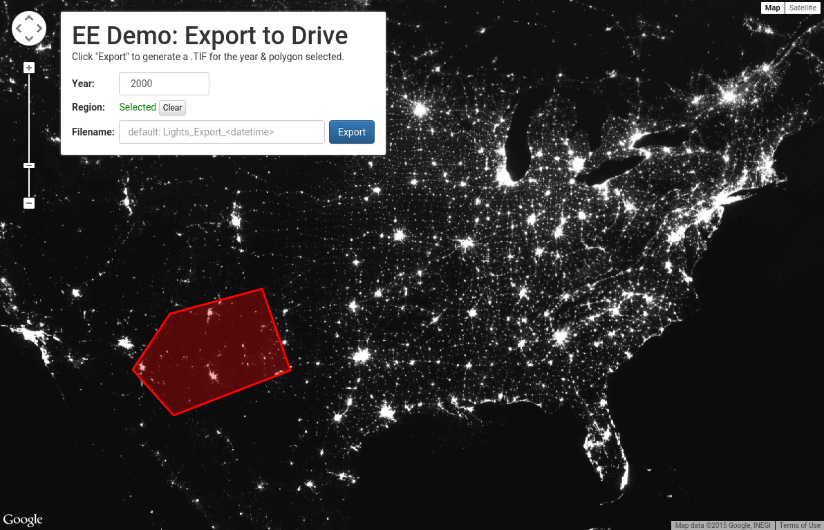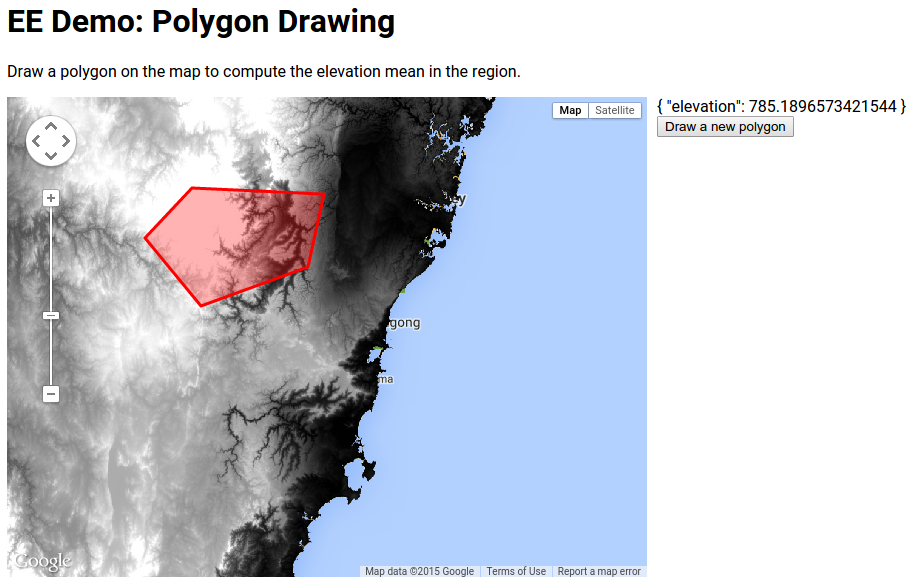 此示例还使用了客户端授权流程。该示例演示了在地图上绘制多边形、在 Earth Engine 中使用多边形执行区域化简化,以及显示多边形均值的功能。(此演示中的所有映射功能都可以使用服务器上生成的 mapid 完成,如服务器身份验证演示中所示)。